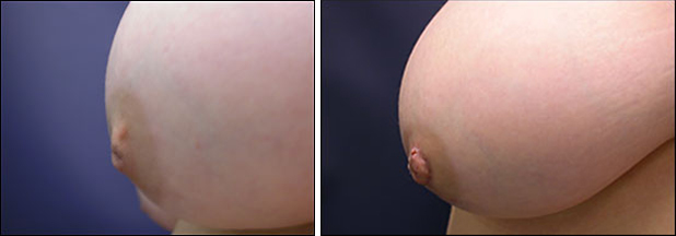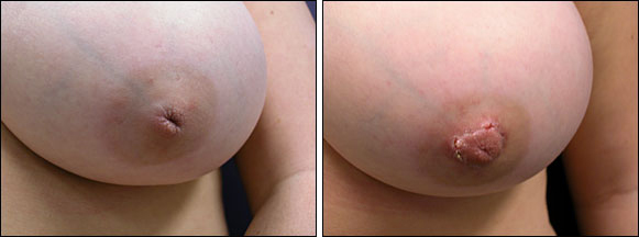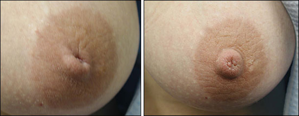 21 year old before and 6 months after correction of right inverted nipple with no scar technique.
