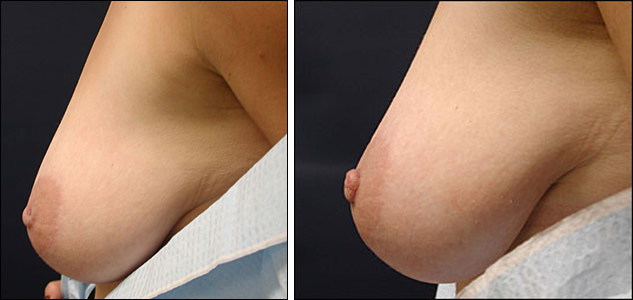 55 year old before and 1 year after correction of right inverted nipple with no scar technique. Unfortunately a side picture taken before her procedure was lost.